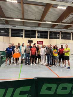 Die am Fastnachtsdienstag teilweise kostümierte Trainingsgruppe, die im Anschluss auf den 75. Geburtstag des Ehrenvorsitzenden Günther Rumpf anstieß