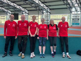 Erfolgreiche LSG-„Oldies“ bei den Hessischen Hallenmeisterschaften im Steinstoßen (v. li.): Stefan Münch, Jürgen Willert, Jutta Kerth, Sabine Grißmer, Ingrid Schäfer und Bernhard Grißmer.