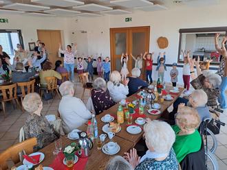 Zum Beweis für die Richtigkeit dieser These gab es dann nach Kaffee und Kuchen erst Bewegungslieder mit den Kindern der Evangelischen Kindertagesstätte „Unterm Regenbogen“. Und abschließend „ausschließlich deutsche Chormusik“ – (augenzwinkernd Chorleiterin Nicole Ebel) mit der Sängervereinigung „Harmonie“. Dazwischen einige Couplets von Hansjürgen Weeber und ein thematisch treffliches Gedicht von Gertrud Weeber. Norbert Friedrich („Nehmen se den Alten“) und Ulrich Finger brachten noch einige weitere launige Vorträge zu Gehör. Und natürlich wurden auch die jüngsten und die ältesten Teilnehmenden ausgeguckt. Und als die Ältesten dann Elsbeth Henecker und Karl-Heinz Bach mit einem kleinen Präsent geehrt wurden.