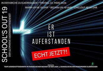 Der School's out-Gottesdienst findet statt am kommenden Freitag, 22. März, ab 18 Uhr in der Evangelischen Auferstehungsgemeinde in der Kirche zu Elkerhausen Pfarrstraße 4 / 35796 Weinbach (Elkerhausen)