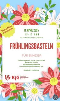 Am 11.04.2025 findet von 15:00 bis 17:00 Uhr ein Bastelnachmittag für Kinder im Pfarrheim Eisenbach statt. Anmeldungen bitte mit Namen und Alter per Mail an kjg-eisenbach@web.de Eine kleine Teilnahmegebühr von 5 € fällt an.