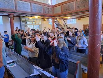 Bildtext: Der Glaube kann auch in Bewegung setzen – nicht nur beim „Warm Up“ im SCHOOL’S OUT Gottesdienst in Weinbach.