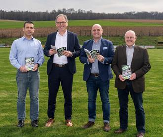 Präsentation der Festschrift auf dem Eisenbacher Sportplatz (von links): Jörg Springer, Landrat Michael Köberle, Manuel Böcher und Stefan Gattinger.