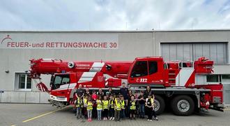 Die Selterser Löschküken vor dem neuen Feuerwehrkran der Berufsfeuerwehr Frankfurt