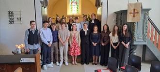 Sechzehn Jugendlich wurden in den Gottesdiensten in Weyer und Münster am Sonntag Kantate konfirmiert. Am vorhergehnden Sonntag war gemeinsamere Vorstellungsgottesdienst in der Weyrer Kirche. Dabei entstand dieses Foto der Konfirmandinnen und Konfirmanden mit Gemeindepfarrer Ulrich Finger.