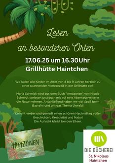 Am 17. Juni 2025 um 16:30 Uhr lädt die Bücherei St. Nikolaus Haintchen alle Kinder im Alter von 4 bis 9 Jahren zu einem ganz besonderen Vorlesenachmittag ein. Unter dem Motto „Lesen an besonderen Orten“ findet die Veranstaltung in der idyllisch gelegenen Grillhütte Haintchen statt.