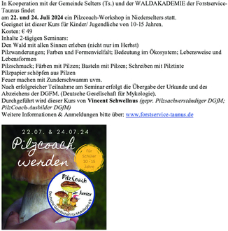 In Kooperation mit der Gemeinde Selters (Ts.) und der WALDAKADEMIE der ForstserviceTaunus findet am 22. und 24. Juli 2024 ein Pilzcoach-Workshop in Niederselters statt.