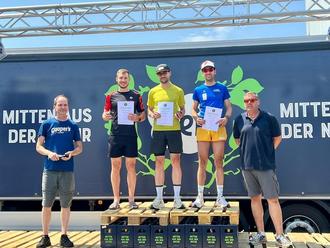 Um 10:15 Uhr startete dann Daniel Schütz über die 2 Runden a 5 Kilometer. Hier waren es insgesamt 320 Frauen und Männer. Vom Start weg auf Platz 2 liegend, baute er seinen Vorsprung gegenüber dem Drittplatzierten klug aus und kam schließlich nach 40:06 Minuten 20 Sekunden vor seinem Verfolger ins Ziel am Hof der Kelterei Heil. Bei der Siegerehrung am Mittag durfte Daniel für seine Leistung den begehrten „ silbernen Apfel „ aus der Hand von Firmenchef Martin Heil in Empfang nehmen. In Anbetracht der hochsommerlichen Temperaturen eine beeindruckende Leistung der 3 Eisenbacher Vertreter.