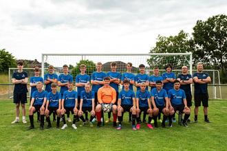 Das Bild zeigt folgender Spieler (stehend von links ) Moritz Frings, Luis Haber, Ansgar Wiche, Moritz Mühleisen, Jack Hancock, Fynn Kühmichel, Felix Staubes, Luca Feilbach, Melos Basholli, Vasili Lobov, Taylan Cinar, Alexander Ewald, Burkhard Stath