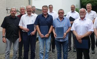 Die Verantwortlichen des MGV Liederkranz Eisenbach nutzten den Rahmen des Hoffestes am 14. und 15. Juni 2025 bei Joachim Böcher, um Mitglieder zu ehren. Musikalisch eröffnet wurde die Ehrung von den Sängern des MGV unter der Leitung von Dr. Georg Hilfrich und dem Bass-Solisten Hans Albert Demer mit dem Lied „Ach ich hab in meinem Herzen“. Für 40jährige fördernde Mitgliedschaft wurden Gerald Hofmann, Dieter Brandenburger und Rainer Zimmermann, für 50 Jahre Stefan Fuhrmann, Clemens Hartmann und Horst Hartmann sowie für 60 Jahre Klaus Kaiser mit einer Urkunde geehrt. Gemeinsam mit Harald Kirchner vom Sängerkreis wurde der 1. Vorsitzende Bernd Hartmann für 50 Jahre aktives Singen beim MGV geehrt. Harald Kirchner würdigte den Vorsitzenden des MGV und überreichte neben den entsprechenden Urkunden den Sängerpass. Der 2. Vorsitzende Rüdiger Jost bedankte sich bei Bernd Hartmann für sein langjähriges Engagement im Verein. Bernd ist ein eifriger Sänger, fehlt kaum eine Gesangstunde, arbeitet im Vorstand schon mehr als 30 Jahre mit. Der 2. Vorsitzende Rüdiger Jost überreichte die entsprechende Urkunde des MGV und ein Präsent. Mit dem „musikalischen Hoch“ bedankten sich die Sänger bei ihrem Sangesfreund Bernd. Der Bass-Solist Hans Albert Demer, begleitet am Piano von Dr. Georg Hilfrich, brachte dem Geehrten zu Ehren das Lied „Eine weiße Birke“.