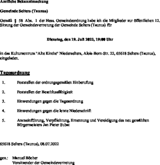 Gemäß § 58 Abs. 1 der Hess. Gemeindeordnung habe ich die Mitglieder zur öffentlichen 12. Sitzung der Gemeindevertretung der Gemeinde Selters (Taunus) für