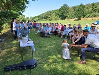 Am meisten Freude hatte aber dann die kleine Anni als Täufling des Tages. Ihr war es gewiss egal, wie viel Potential und Kraft fließendes Wasser hat, wie viele Mühlen im Laubustal einst durch seine Kraft angetrieben worden waren, und wie Luther das Verhältnis von Glaube und Wasser zu erklären wusste: Sie genoss das kühlende Wasser ihrer Taufe - Wasser aus dem Laubusbach, das bereits vor Gottesdienstbeginn aus jenem Bach geholt worden war, in dem dann später auch die Getränke-Kisten gekühlt wurden.
