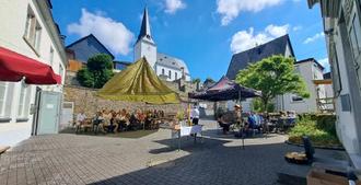 Selters-Münster (uf) Eine bunte Gemeinde aus allen Generationen feierte bei strahlendem Sonnenschein unter einem riesengroßen Sonnenschutz in Münster ein Pfarrhoffest – Grund war der Abschluss der Renovierungsarbeiten an der Kirche, die sich an diesem Tag im strahlenden Sonnenschien zeigte.