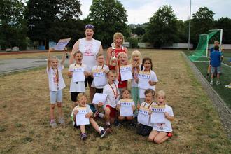 Die U10 Wettbewerbe waren am stärksten besucht. Hier gingen insgesamt 18 Teams mit 150 Mädchen und Jungen an den Start. Von der LSG nahmen gleich zwei Mannschaften teil. Sie wurden durch Petra Will und Friederike Schoppe betreut. Als „LSG Goldies III“ starteten Max Hundler, Paul Kaiser, Lars Gottschling, Mia Wehnert, Maja Sturm, Erik Fliegner, Charlotte und Leonard Gindra. Unter dem Namen „LSG Goldies IV“ gingen Liam Fladung, Mads Fürbeth, Emil Weil, Noel Höpp, Emil Heynen und Julian Holz an den Start. Auch sie alle genossen die spannenden geschlechtergemischten Wettbewerbe und erlebten ein echtes Mannschaftsgefühl. Das 1. Team war das beste von allen 18 Teams im Hoch-Weitsprung, 2. in der Biathlonstaffel - bei der Treffsicherheit im Werfen kombiniert mit Laufen gefragt ist - 3. im Schlagwurf mit dem Heuler und 4. in der Hindernispendelstaffel. In der Endabrechnung bedeutete dies den hervorragenden 2. Platz. Die „LSG Goldies IV“ wurden insgesamt 9. und erzielten ihre beste Platzierung als 3. der Biathlonstaffel. In der Cup Wertung aller 3 Wettkämpfe sicherten sich die LSG Goldies den tollen 2. Platz. Auch sie nahmen voller Freude ihre Urkunden, Medaillen und einen Pokal entgegen.