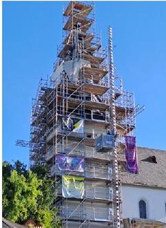Immer wieder bleiben Passanten stehen und schauen auf das hohe Gerüst am Turm der Münsterer evangelischen Kirche. Dringend notwendig, so Kirchenvorstandsvorsitzender Otto Hofmann, war die Sanierung des Daches des Kirchturms. An zahlreichen Stellen waren Undichtigkeiten aufgetreten, Wasser drang ein in den Turm, gefährdete das Mauerwerk, aber auch Uhrwerk und Glockenanlage.