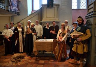 Hadamar (uf) Eine große Gottesdienstgemeinde verfolgte mit Spannung und Freude die Aufführung des „500. Hochzeitstages der Eheleute Luther“. In der Hadamarer Schlosskirche wurde das besondere Stück als Gottesdienst am Samstag des dortigen Mittelalterfestes aufgeführt. Neben den beiden Spielenden, Prädikantin Tina Kaiser aus Oberzeuzheim und Pfarrer Ulrich Finger aus Münster, wirkten als Musizierende Harfinistin „Regilau“ und an der Orgel Dr. Nils Bergmann mit. Im Anschluss an den Gottesdienst stellten sich die Mitwirkenden und einige aus der Gottesdienstgemeinde noch zu einem Gruppenbild für die Fotografin auf.