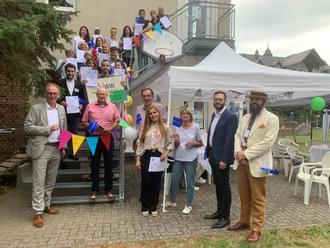Landrat Michael Köberle (links) überreichte Zertifikate an die WIR-Integrationslotsinnen und –lotsen. Rechts unten auf der Treppe der Hadamarer Bürgermeister Michael Ruoff, rechts daneben der Vorsitzende des Kinderschutzbundes Limburg-Weilburg, Wolfgang Erk, Zweiter von rechts der 2. Vorsitzende des Kinderschutzbundes Limburg-Weilburg, Christian Radkovsky.