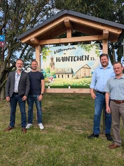 Die Erdarbeiten wurden vom örtlichen Bauhof durchgeführt, während die Zimmerarbeiten von der Firma Grund + Metzler übernommen wurden, bei Layout und Druck unterstützte Christian Decker. Die Wahrzeichen von Haintchen, die Kirche aus dem Jahr 1750 und das alte Schulgebäude von 1843, umrahmt von Wald und Wild, sind auf den Schildern zu sehen. Dieses Projekt wurde durch einen großzügigen Zuschuss von der Jagdgenossenschaft Haintchen ermöglicht.