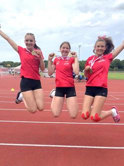 Freude pur: Wurden Hessenmeisterinnen im Mannschaftssiebenkampf (v. li.): Lu Nierfeld, Hanna Schneider und Pauline Schmitt; Lu außerdem Hessenmeisterin im 4-Kampf und Hanna Hessenmeisterin im 7-Kampf und Vizemeisterin im 4-Kampf.