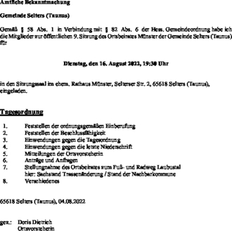 Gemäß § 58 Abs. 1 in Verbindung mit § 82 Abs. 6 der Hess. Gemeindeordnung habe ich die Mitglieder zur öffentlichen 9. Sitzung des Ortsbeirates Münster der Gemeinde Selters (Taunus) für