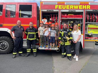 Daraufhin konnten die jüngeren Kita-Kinder in die Einrichtung zurückkehren, während für die älteren eine Brandschutzerziehung folgte. Allerdings nicht, bevor sie eine Runde in dem großen Feuerwehrfahrzeug drehen durften. Sie lernten unter anderem den Unterschied zwischen „gutem“ und „schlechtem“ Feuer, erfuhren, was Feuer braucht, damit es entsteht und brennt, erhielten eine praktische Einweisung in das Löschen eines echten kleinen Feuers und wurden an die Notrufnummer 112 erinnert.