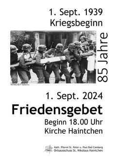 Am 1. September jährt sich zum 85. Mal der Überfall des nationalsozialistischen Deutschlands auf Polen. Der 1. September 1939 markiert gleichzeitig den Beginn des 2. Weltkrieges sowie des systematischen Völkermordes an den europäischen Juden, Sinti und Roma sowie anderer Gruppen. Der Ortsausschuss Haintchen nimmt dies zum Anlass am 1. September zu einem Friedensgebet einzuladen. Es beginnt um 18.00 Uhr in der Kirche St. Nikolaus in Haintchen.