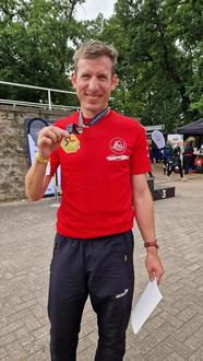Große Freude bei Sven Medenbach: Er wurde in einer exzellenten Zeit Deutscher Meister der M35 über 110 m Hürden und gewann zudem die Bronzemedaille über 200 m.
