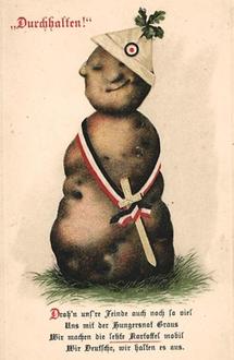Besonders in Kriegs- und Notzeiten spielte die Kartoffel eine große Rolle. Nicht nur in vielfältiger Form auf Speiseplan und Eßtisch, sondern auch in der Propaganda.
