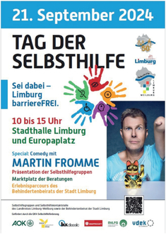 Limburg. Unter dem Motto „Sei dabei – Limburg barriereFREI“ präsentieren sich in die- sem Jahr die Selbsthilfegruppen aus dem Landkreis Limburg-Weilburg sowie der Behin- dertenbeirat der Stadt Limburg am Tag der Selbsthilfe in der Josef-Kohlmaier-Halle und auf dem Europaplatz Limburg. Am Samstag, 21. September 2024, von 10 bis 15 Uhr dreht sich wieder alles rund um das Thema Selbsthilfe, Inklusion und Gesundheit. Teilnehmen- de Selbsthilfegruppen und Beratungseinrichtungen informieren über ihre wichtige Funktion und vielfältigen Angebote in der gesundheitlichen Versorgung. Der Behindertenbeirat der Stadt Limburg präsentiert sich mit einem Hindernisparcours zum Perspektivwechsel auf dem Europaplatz. Besonderes Highlight des diesjährigen Tags ist der Comedy-Auftritt von Martin Fromme, Deutschlands einziger asymmetrischer Komiker. Er beleuchtet auf unter- haltsame Weise das Thema Behinderung und sorgt so für Lachen und Nachdenken.