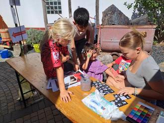 Dass es auch Angebote mit Kindern und für Kinder gibt - das war auf dem Platz vor der alten Schule beim Fest "50 Jahre Selters" in Münster auch selbstverständlich. Eine Hüpfburg ist ja für die Kinder aus Münster schon fast eine Tradition bei jedem Fest. Aber ein besonderes Ereignis war das Angebot, gekonnt geschminkt zu werden. Phantasievolle Gesichter und poppige Tatoos gab es in großer Zahl, so dass es auch den Kindern nicht langweilig wurde, wenn die "Großen" sich was zu erzählen hatten.