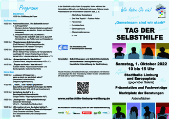 Am Samstag, 1. Oktober, 10.00 Uhr bis 15.00 Uhr, werden sich in der Limburger Stadthalle sowie auf dem Europaplatz (gegenüber Galeria) 50 Selbsthilfegruppen aus dem Landkreis Limburg-Weilburg sowie Beratungseinrichtungen präsentieren. Jeder Interessierte ist herzlich eingeladen, sich dort kostenlos zu informieren. Betroffene aus vielen Bereichen und ihre Angehörige finden beim Tag der Selbsthilfe für offene Fragen viele kompetente Ansprechpartnerinnen und Ansprechpartner, die meist eigene Erfahrungen mit Krankheiten, Behinderungen, Süchten, Psychischen Erkrankungen und vielen anderen Themen haben. Es wird aber auch den ganzen Tag über interessante Fachvorträge geben sowie spannende Mitmachaktionen. So können Gäste einmal in einem Alterssimulationsanzug oder auf einem Demenzparcours austesten, wie es sich anfühlt, gebrechlich zu sein. Es wird auch ein Dunkelkaufhaus geben, wo die Besucherinnen und Besucher erleben können, wie es ist, blind zu sein.