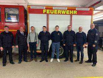 (v.l.n.r.:) Volker Kaiser (2.stellv. Gemeindebrandinspektor), Jens Stath (Wehrführer/ Vorsitzender), Jan Pieter Subat (Bürgermeister), Ruben Wagner, Louis Bördner, Jürgen Roth (Leiter der Einsatzabteilung), Manuel Böcher (Vorsitzender der Gemeindevertretung), Björn Schulz (Gemeindebrandinspektor)