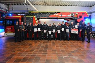 Die Geehrten und Beförderten zusammen mit den Neuen und Spendenübergebenden