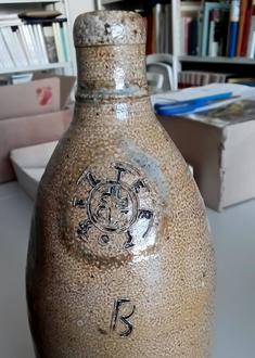 Selters-Stempel, Kurtrierer Kreuz und die Buchstaben CT kennzeichnen die 250 Jahre alten Selterswasserkrüge aus kurtrierischer Zeit, die als Neuerwerbung des Kultur- und Geschichtsvereins jetzt die Krug- und Flaschensammlung im Niederselterser Brunnenmuseum ergänzen. Foto: Königstein