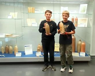 Als jüngste Mitglieder des Kultur- und Geschichtsvereins durften die Freunde Nevio und Tom (von links) die neu erworbenen Selterswasserkrüge in einer Vitrine des Niederselterser Brunnenmuseums platzieren. Foto: Königstein