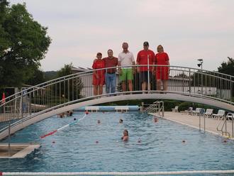Von höherer Warte haben Bademeister Martin Petrich ( Mitte) und die Aktiven der DLRG-Ortsgruppe die Sicherheit der Gäste im Niederselterser Freibad im Blick.