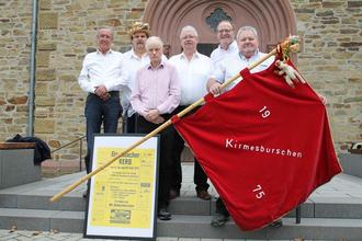 Stolz präsentiert der Kerbejahrgang 1975, der dieses Jahr sein 50jähriges Jubiläum feiert, die seinerzeit von den Eltern selbst genähte Fahne und das ausgehängte Plakat.