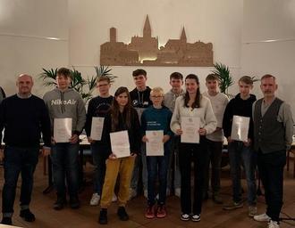 Bürgermeister Jan Pieter Subat und Manuel Böcher, Vorsitzender der Gemeindevertretung, freuen sich über das Interesse an der Gemeindepolitik und über die Anregungen, die in Zukunft in die politischen Entscheidungen mit einfließen. Sie überreichten den Jugendlichen ihre Benennungsurkunden: