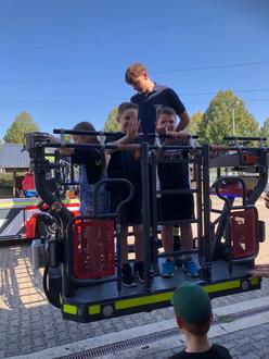 Die Selterser Löschküken zusammen mit Marvin im Korb der Drehleiter