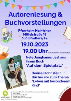 Das Team der Bücherei Haintchen lädt für Donnerstag, 19.10.2023, um 19 Uhr (nach dem Gottesdienst) zu einer Autorenlesung und Buchvorstellungen herzlich ein. Veranstaltungsort ist das katholische Pfarrheim in der Mittelstraße 18 in Haintchen.