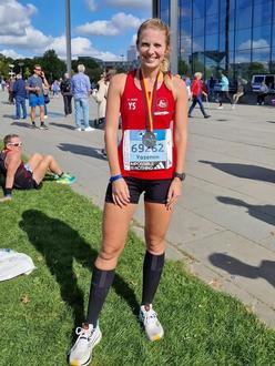 Freudestrahlendes Erinnerungsfoto von Yasemin Simon-Pfeiffer beim Berlin Marathon.