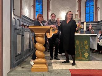 Die markanten Textstellen wurden musikalisch unterstrichen durch Gemeindepfarrer Ulrich Finger, der trefflich passende Lieder vortrug: Das Lied: "Mein Vater wird gesucht", das aus der Sicht eines Kindes Misshandlung und Ermordung beschreibt; das Lied "Spaniens Himmel breitet seine Sterne" als Lied der internationalen Brigaden, das der Großvater der Enkelin immer wieder vorgesungen hatte. Dann aber auch Wolf Biermanns "Du lass dich nicht verhärten" und das international bekannte "Was wollen wir trinken". Einen musikalischen Rahmen bildete die Sängervereinigung "Harmonie" aus Münster.