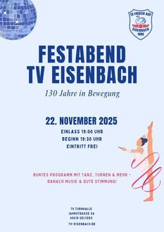 Der Turnverein Eisenbach feiert in diesem Jahr ein besonderes Jubiläum: 130 Jahre Vereinsgeschichte. Aus diesem Anlass lädt der Verein alle Mitglieder, Freunde und Interessierten herzlich zum Festabend „130 Jahre in Bewegung“ ein.