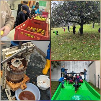 In den Herbstferien lud das Team von Zeitfrei St. Nikolaus Haintchen zu einem „Apfeltag“ ins Pfarrheim Haintchen ein. Die 25 Kinder durften an dem Morgen gemeinsam das Pfarrheim erkunden, den Tischkicker nutzen, die Bücherei besuchen und jeder der wollte, durfte eine Stofftasche herbstlich bemalen. Danach ging es schon zur Freude aller mit dem Planwagen eine Runde durch Haintchen bis zur Apfelwiese. Ein Dankeschön geht hier an Andreas Pabst für die Planwagenfahrt und Fabian und Heribert Stath für die Apfelspende. Auf der Wiese durften die Kinder fleißig Äpfel aufsammeln. Nach der getanen Arbeit und dem Spaziergang zurück zum Pfarrheim gab es zur Stärkung ein gemeinsames Mittagessen. Und passend zum Thema Apfel zum Nachttisch leckeren Apfelcrumpel mit Vanillesoße. Gestärkt ging es dann an die Verarbeitung der gesammelten Äpfel. In kleinen Gruppen durften die Kinder Äpfel schneiden, Äpfel entsaften und zu Marmelade einkochen oder mit der Apfelpresse leckeren Apfelsaft machen. Die Zeit ging leider wieder viel zu schnell vorbei und zum Abschied durfte jeder ein Glas Marmelade, seine Stofftasche und wer wollte etwas Apfelsaft mit nach Hause nehmen. Es war wieder ein gelungener Tag für die Kinder und auch das Team von Zeitfrei St. Nikolaus.