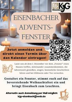 Auch in diesem Jahr gibt es wieder die Eisenbacher Adventsfenster, ins Leben gerufen seitens der KjG Eisenbach. Zusammenkommen, innehalten, Geschichten hören und bei Glühwein oder Tee Zeit gemeinsam genießen, Eisenbach zum Leuchten bringen. Auch in diesem Jahr gestaltet der Ortsausschuss Eisenbach wieder ein Fenster anlässlich des Friedenslichts, Turnverein, freiwillige Feuerwehr und Liederkranz haben sich auch schon angemeldet. Auch Privatpersonen sind herzlich eingeladen, über den QR-Code einen Termin einzutragen. Auch eine Anmeldung per Mail an KjG-eisenbach@web.de ist möglich.