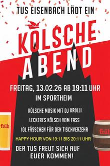 Der TuS veranstaltet auch in diesem Jahr wieder seinen traditionellen Kölsche Abend und lädt schon heute alle Närrinnen und Narrhalesen aus nah und fern, am 13.02.2026 ab 19:11 Uhr ganz herzlich ins Sportheim ein. Für "Kölsche" Faschings-Stimmung wird DJ Krölli sorgen. Natürlich wird es wieder leckeres Kölsch vom Fass und 10l Fässchen zum "Selbstzapfen" geben. Außerdem ist von 19:11 Uhr bis 20:11 Uhr eine Happy Hour angesagt.