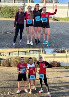 Frauenpower über 5 km: Siegerin Mara Fladung (LSG, 2. v. li.) und Vereinskameradin Lucija Heun (LSG, re.) mit der Zweitplatzierten Chantal Buschung (Spiridon Frankfurt, li.) und Lisa Müller von der VLG (2. v. re.). Starke Männermannschaft über 10 km (v. li.): André Fladung, Toni da Conçeicão und Peter Ringeisen.