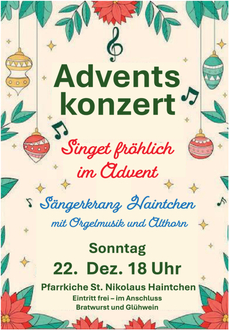 Am vierten Adventssonntag, dem 22. Dezember 2024, um 18.00 Uhr, findet das diesjährige Adventskonzert des Gesangvereins „Sängerkranz“ Haintchen in der stimmungsvollen Pfarrkirche St. Nikolaus in Haintchen statt. Das diesjährige Motto „Singet fröhlich im Advent“ findet sich in den zahlreichen Advents- und Weihnachtsliedern wieder. Das Konzert wird durch musikalische Beiträge des Organisten Stephan Wiegand und der Althornistin Isabell Stein bereichert. Nach dem Konzert laden wir alle ein, sich mit Glühwein und Bratwurst zu stärken und das Konzert in geselliger Runde nach- und ausklingen zu lassen.
