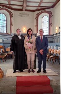 Überrascht wurde beim Gottesdienst in der Münsterer Kirche Organistin Nicole Ebel. Im Zuge der Abkündigungen kurz vor Gottesdienst-Ende wurde sie von Gemeindepfarrer Ulrich Finger nach unten in den Altarraum gebeten, wo sie dann vom Vorsitzenden des Kirchenvorstandes Otto Hofmann ein herzliches Dankeschön für 30 Jahre Orgeldienst in der Münsterer Kirche in Wort und Präsent geehrt wurde.