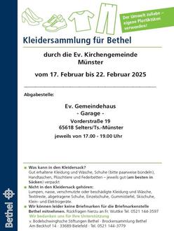 Die Kleidersammlung für Bethel, durchgeführt von der ev Kirchengemeinde Münster, findet vom 17.Februar bis 22. Februar 2025 statt.